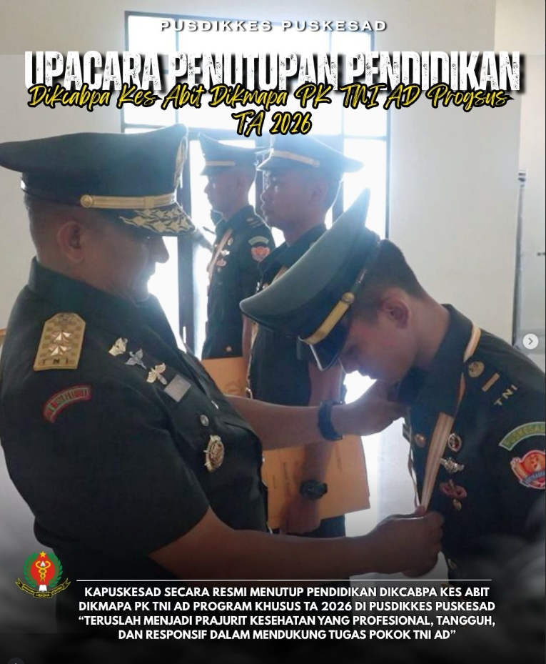 RESMI DITUTUP DIKCABPA KES ABIT DIKMAPA PK TNI AD PROGRAM KHUSUS TA 2026Kepala Pusat Kesehatan TNI Angkatan Darat (Kapuskesad) Mayjen TNI dr. Bima Wisnu Nugraha, Sp.THT., M.Kes.,...