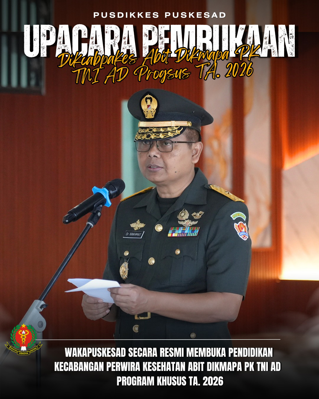 Brigjen TNI dr. Rakhmat Haryanto Buka Pendidikan Dikcabpa Kes Abit Dikmapa PK TNI AD Progsus TA 2026Jakarta (03/02/2026) – Wakil Kepala Pusat Kesehatan Angkatan Darat...